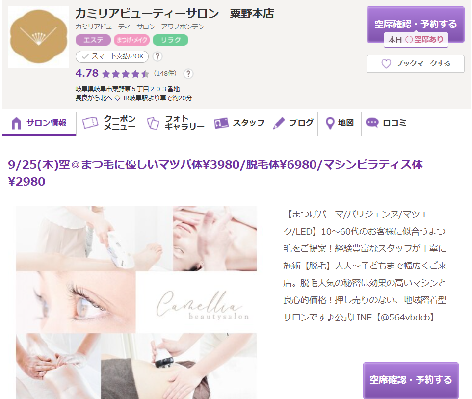 岐阜エリアでおすすめのBEST2にご紹介するまつ毛サロン「カミリアミューティーサロン 粟野本店」は、まつ毛やアイブロウ以外にも、フェイシャルやボディといった、トータルビューティーに特化したメニューが豊富な専門店です。